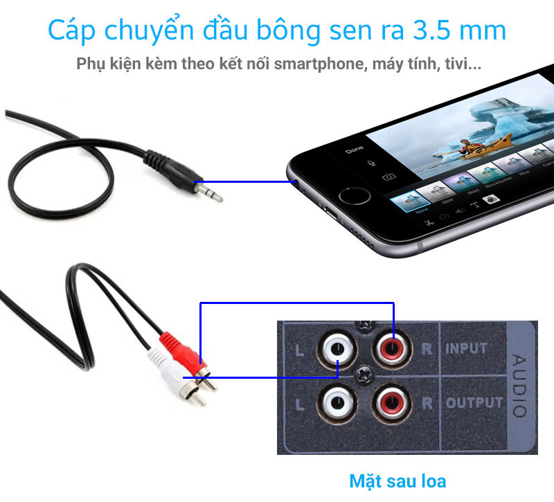 +Dùng cáp chuyển bông sen - 3.5mm theo kèm loa.