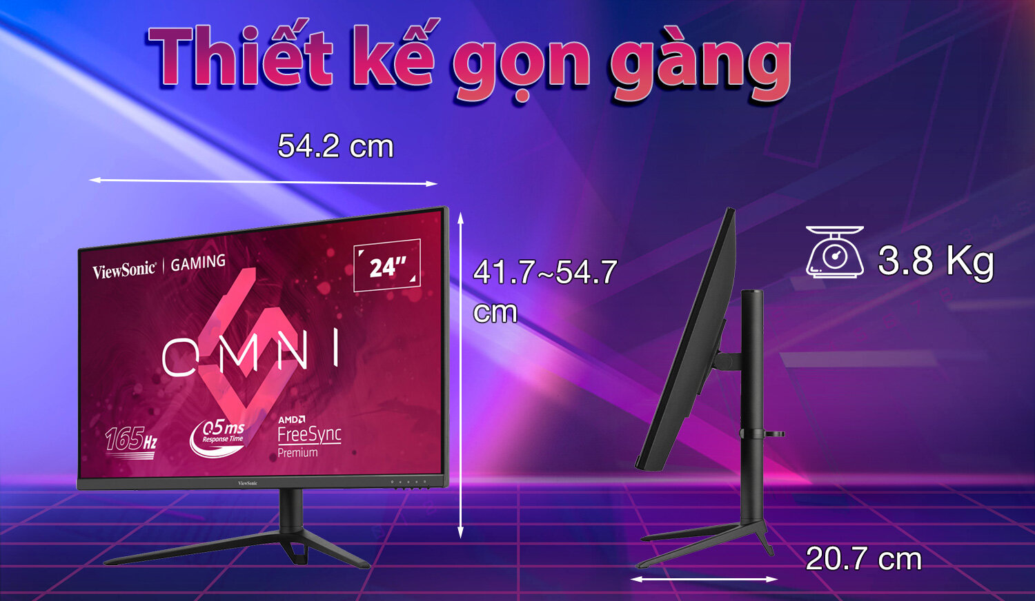 Màn hình Viewsonic VX2428J có trọng lượng tổng thể 3.8 kg cùng kích thước rộng 54.2 cm, cao 56.9 cm. Dù chân đế được cấu thành từ nhựa nhưng vẫn tỏ rõ sự cứng cáp thiết kế gọn nhẹ, mang đến sự di động cho phép bạn di chuyển đến bất kỳ vị trí nào trên bàn làm việc hay bàn học một cách dễ dàng.
