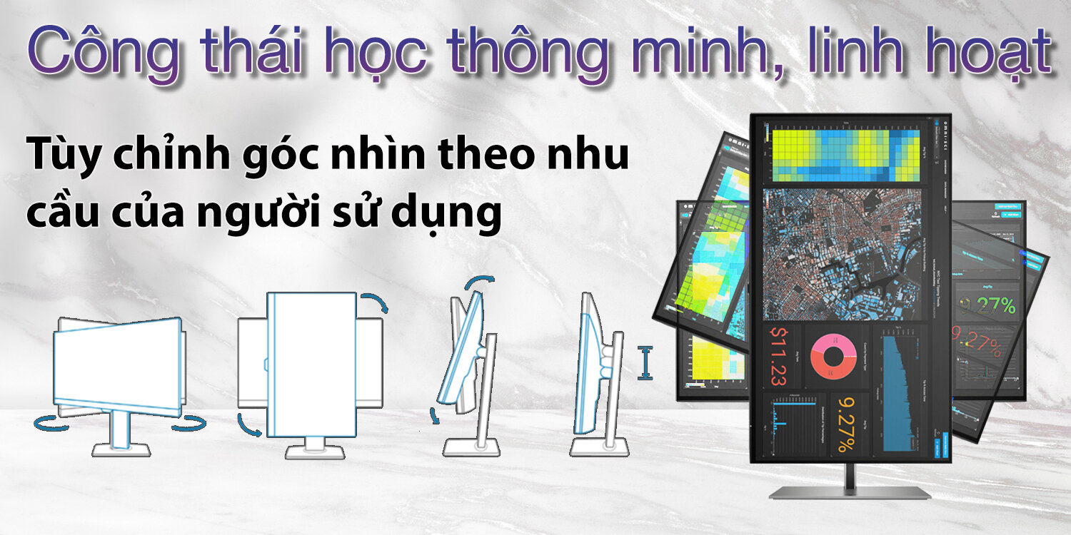 Chức năng nghiêng, nâng, xoay và xoay cho phép bạn điều chỉnh màn hình để phù hợp nhất với phong cách của mình. Sắp xếp và làm gọn gàng không gian bàn làm việc của bạn với tính năng quản lý cáp. Ngoài ra, khả năng gắn VESA của nó cho phép bạn tối ưu hóa không gian có sẵn trong văn phòng.