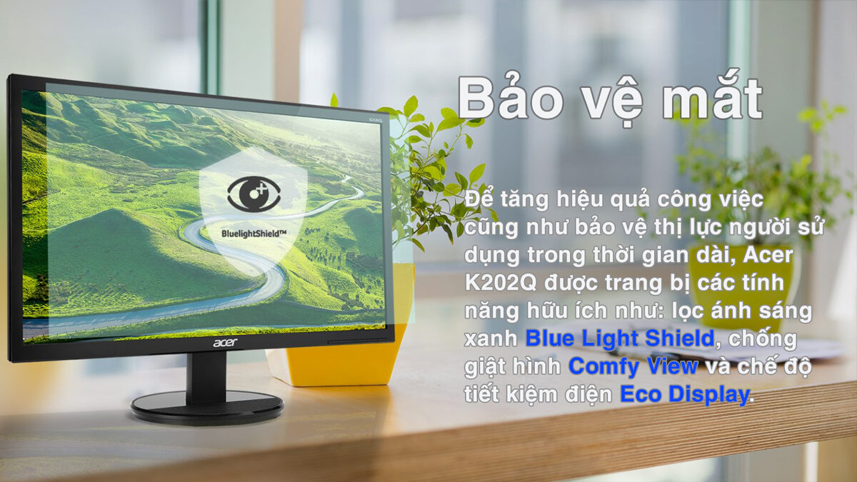 Acer K202Q được trang bị công nghệ Acer BlueLightShield, giúp giảm thiểu ánh sáng xanh có hại cho mắt, bảo vệ sức khỏe người dùng khi sử dụng màn hình trong thời gian dài. Ngoài ra, công nghệ ComfyView giúp giảm độ chói và phản chiếu, mang lại trải nghiệm xem thoải mái hơn ngay cả trong điều kiện ánh sáng mạnh.