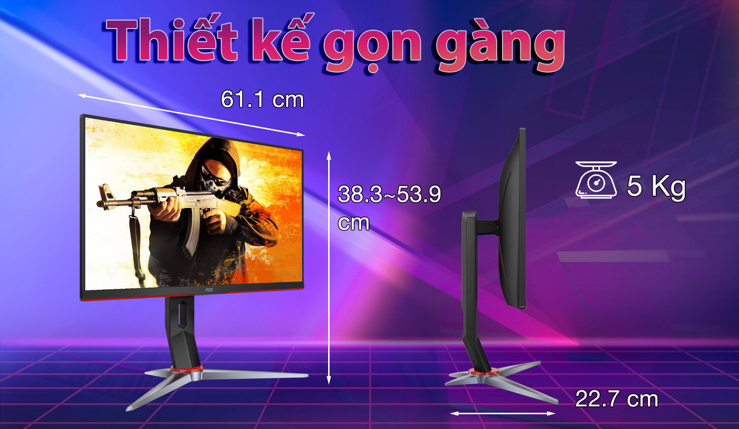 Trọng lượng tổng thể 5.6 kg cùng kích thước rộng 61.1 cm. Độ cao tùy chỉnh linh hoạt 39.8~52.8 cm. Chân đế chữ V đậm chất gaming, tối giản nhưng vẫn đảm bảo tính ổn định cần có. Người dùng dễ dàng có thể di chuyển đến bất kỳ vị trí nào một cách dễ dàng.