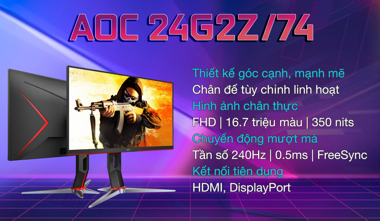 Màn hình chơi game AOC 24G2Z với kích thước 24 inch sẽ mang đến cho bạn trải nghiệm chơi game tuyệt vời nhất. Với thời gian phản hồi 0.5ms, tốc độ làm mới 240Hz và công nghệ AMD FreeSync, bạn sẽ không bị giật hoặc rạn màn hình khi chơi game mà thậm chí còn có thể trải nghiệm chơi game mượt mà hơn. Tấm nền IPS cung cấp màu sắc sống động và góc nhìn rộng, giúp bạn có trải nghiệm chơi game tuyệt vời hơn bao giờ hết.