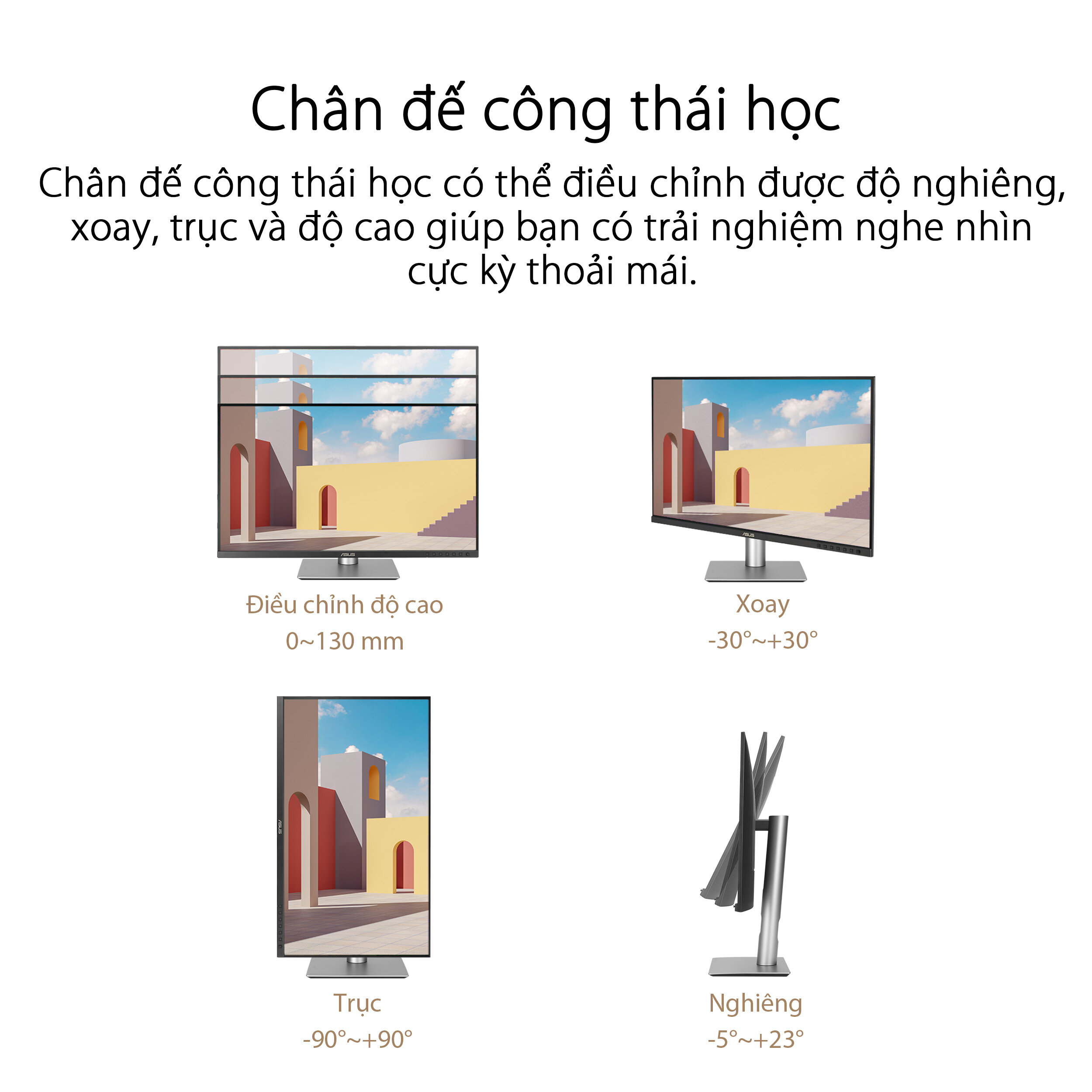 Mỗi màn hình ProArt đều có giá đỡ công thái học với các điều chỉnh độ nghiêng, xoay, trục và độ cao để xem thoải mái. Chức năng xoay màn hình 90° theo chiều kim đồng hồ hoặc ngược chiều kim đồng hồ trong chế độ Chân dung rất hữu ích khi làm việc với tài liệu dài, lập trình hoặc duyệt web. Hơn nữa, tính năng tháo nhanh giúp bạn dễ dàng gắn màn hình thông qua giá treo tường VESA tích hợp―không cần vít, vì vậy quá trình này hoàn tất trong vài giây!