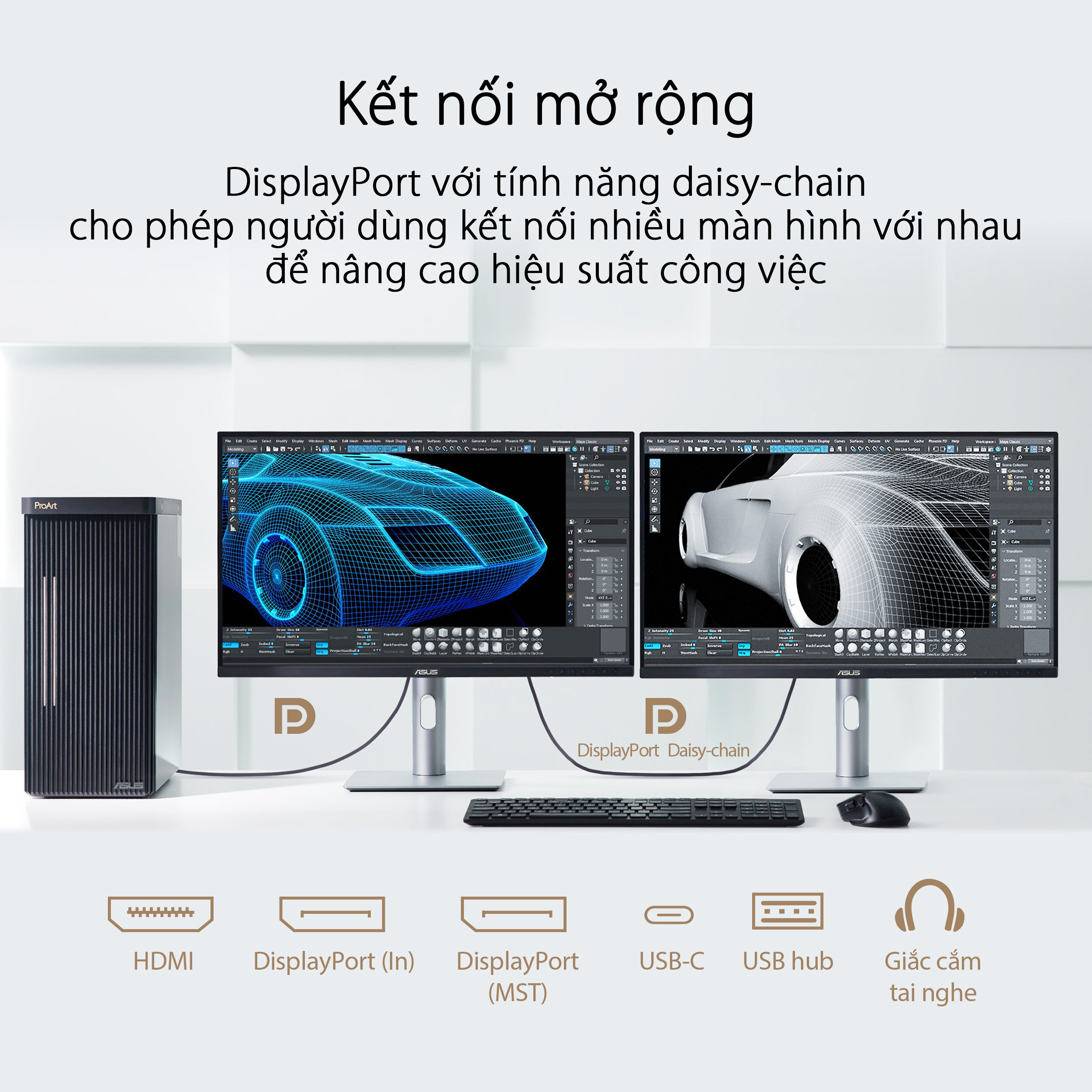 Ngoài USB-C, màn hình ProArt còn cung cấp nhiều tùy chọn kết nối khác như HDMI®, DisplayPort™ (hỗ trợ daisy-chain), USB Type-A và cổng USB-C downstream bổ sung để tương thích với nhiều thiết bị khác nhau. DisplayPort cho phép người dùng chuỗi daisy nhiều màn hình từ một nguồn video duy nhất, tăng cường năng suất làm việc. PA279CRV cũng bao gồm một cổng để cắm tai nghe.