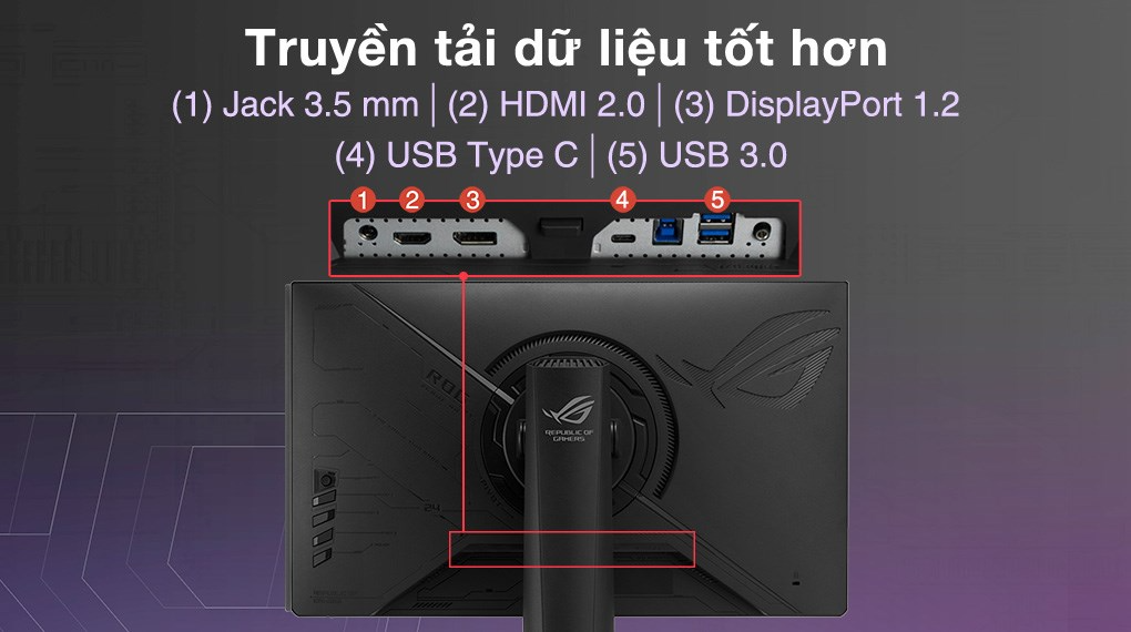 Hỗ trợ các kết nối đa dạng bao gồm HDMI, DisplayPort. Với những tính năng và thiết kế tiện dụng, màn hình Gaming ASUS ROG STRIX XG249CM là một lựa chọn tốt cho những người sử dụng cần một sản phẩm màn hình chất lượng với mức giá phải chăng. Bên cạnh đó, tích hợp bên trong màn là bộ hub USB hỗ trợ truyền tải dữ liệu hoặc các tính năng khác qua như sạc điện thoại, tablet thông qua cổng USB-C 15W, kết nối phím chuột qua USB....