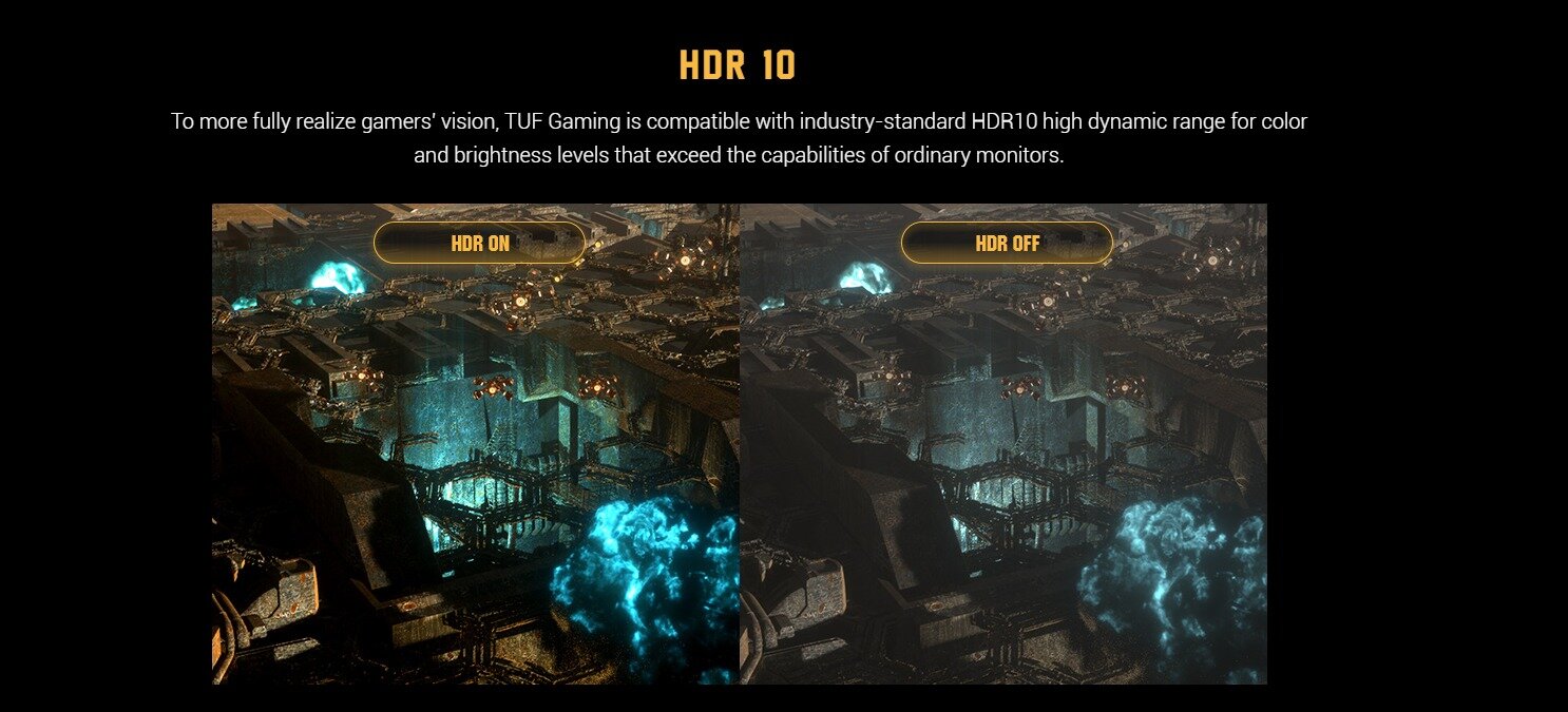 Để cải thiện tầm nhìn của game thủ, TUF Gaming tương thích với dải nhạy sáng rộng HDR10 tiêu chuẩn công nghiệp cho mức độ màu sắc và độ sáng vượt quá khả năng của màn hình thông thường.
