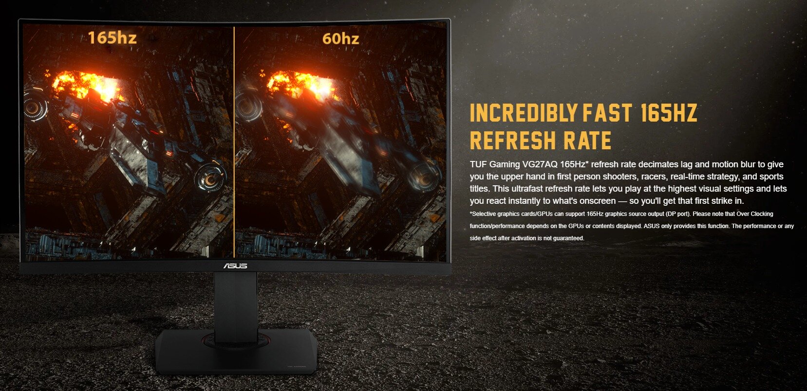 Tốc độ làm mới TUF Gaming VG27AQ 165Hz làm giảm độ trễ và độ mờ chuyển động để giúp bạn chiếm ưu thế trong các game bắn súng góc nhìn thứ nhất, đua xe hay chiến lược thời gian thực và các tựa game thể thao.Tốc độ làm mới cực nhanh này cho phép bạn chơi ở cài đặt cấu hình cao nhất và cho phép bạn phản ứng ngay lập tức với những gì thấy trên màn hình.