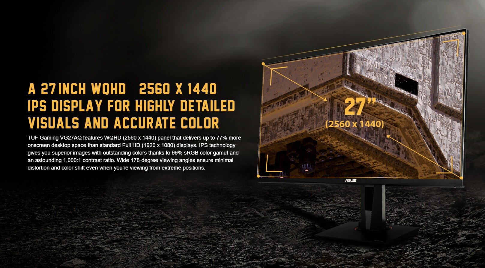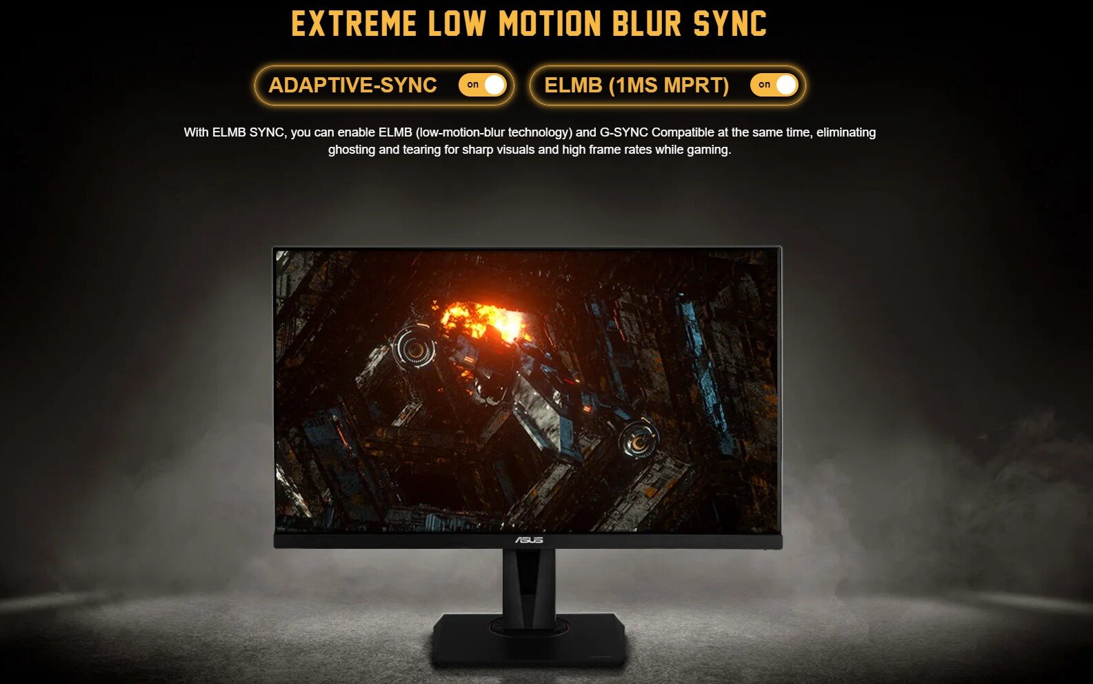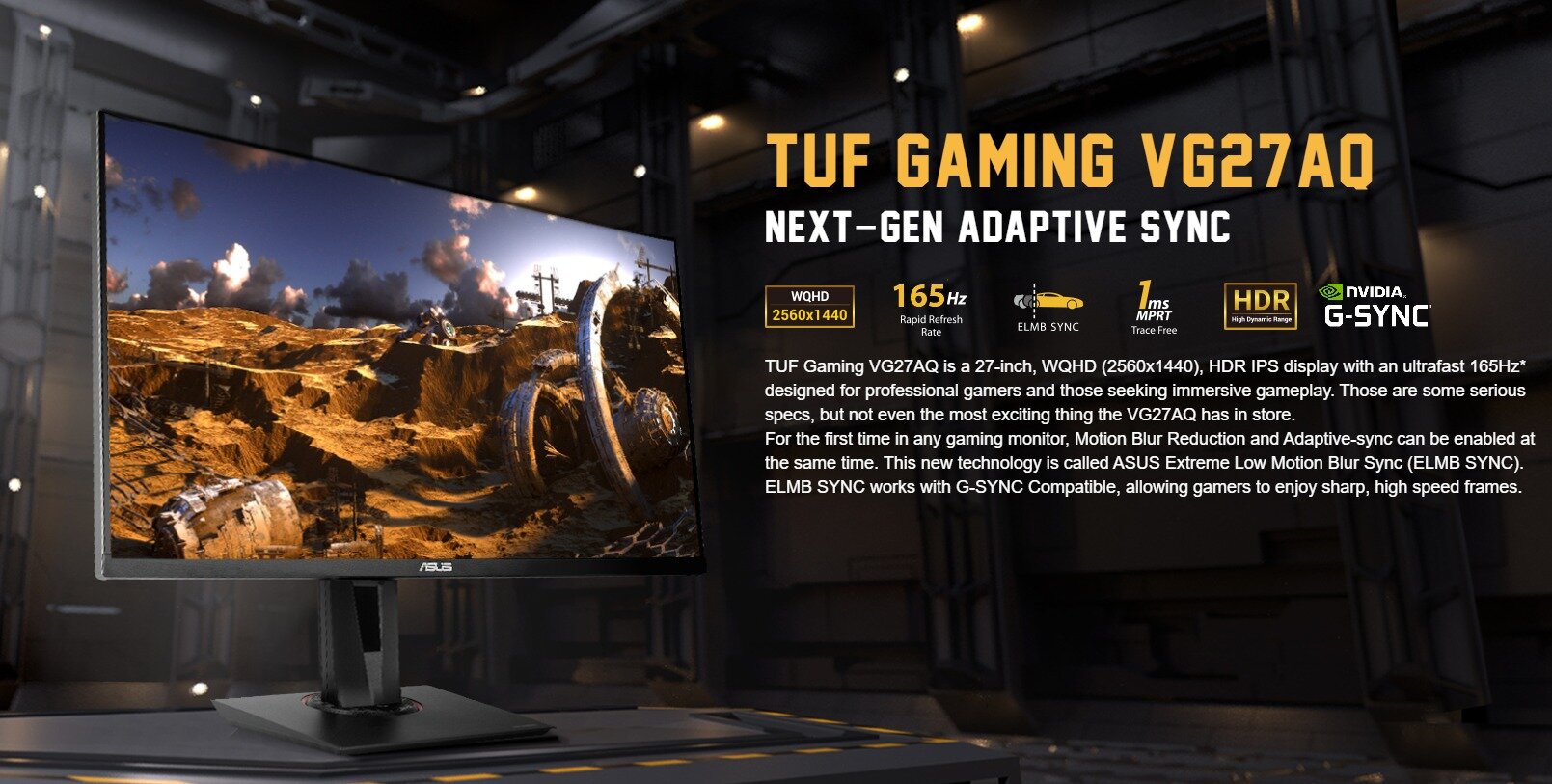 TUF Gaming VG27AQ là màn hình IPS, 27 inch, độ phân giải QHD (2560x1440), với tần số quét 165Hz được thiết kế cho các game thủ chuyên nghiệp Lần đầu tiên Motion Blur và Adaptive-sync có thể được bật cùng một lúc. Công nghệ mới này được gọi là ASUS Extreme Low Motion Blur Sync (ELMB SYNC). ELMB SYNC hoạt động với G-SYNC Compatible, cho phép game thủ thưởng thức các khung hình sắc nét, tốc độ cao.
