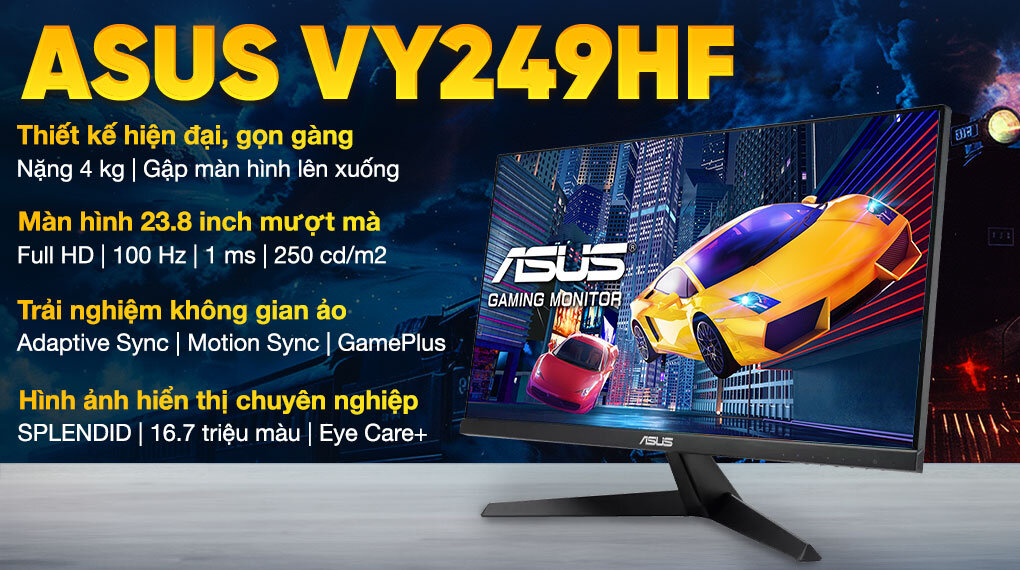 ASUS VY249HF là một trong những lựa chọn hàng đầu cho những ai đang tìm kiếm một chiếc màn hình chất lượng cao với mức giá phải chăng. Với độ phân giải Full HD 1080p, tần số quét 100Hz và tấm nền IPS, sản phẩm này mang đến hình ảnh sắc nét, màu sắc sống động và trải nghiệm chơi game mượt mà.