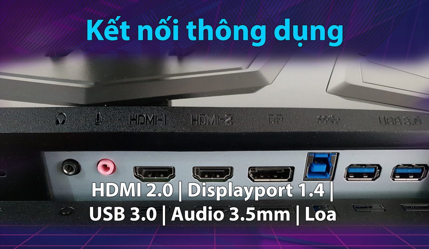 Hỗ trợ kết nối HDMI, DisplayPort cho ra chất lượng hình tốt nhất có thể. Cổng Audio 3.5mm kết nối với các thiết bị âm thanh ngoại vi thuận tiện với nhu cầu giải trí, gaming.