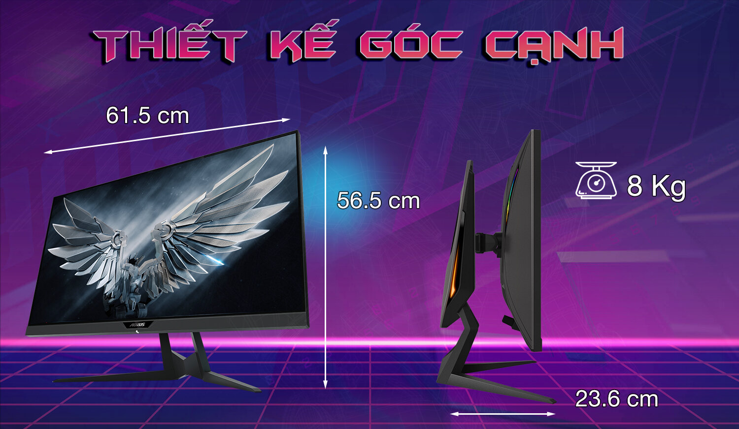 Gigabyte FI27QP-EK có trọng lượng tổng thể 8 kg cùng kích thước rộng 61.5 cm, cao 56.5 cm với các đường nét sắc nét và vẻ ngoài khá hầm hố. Chân đế hình chữ Y có lớp hoàn thiện bằng kim loại sơn tĩnh điện màu đen mờ, mang lại vẻ ngoài và cảm giác cao cấp. Viền trên và viền bên khá mỏng, với thiết kế tràn viền 3 cạnh. Viền dưới dày hơn, bằng nhựa đen mờ với logo AORUS màu bạc sáng bóng ở chính giữa, với viền bao quanh màu đen bóng.