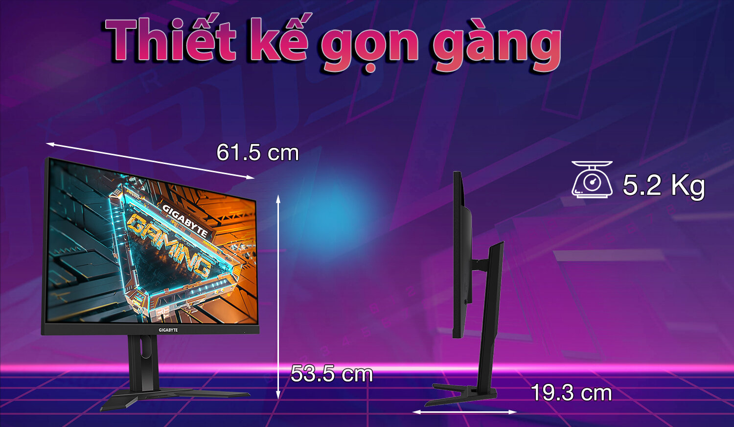 Gigabyte G27F 2-EU có trọng lượng tổng thể 5.2 kg cùng kích thước rộng 61.5 cm, cao 53.5 cm . Dù chân đế được cấu thành từ nhựa nhưng vẫn tỏ rõ sự cứng cáp thiết kế gọn nhẹ, mang đến sự di động cho phép bạn di chuyển đến bất kỳ vị trí nào trên bàn làm việc hay bàn học một cách dễ dàng.