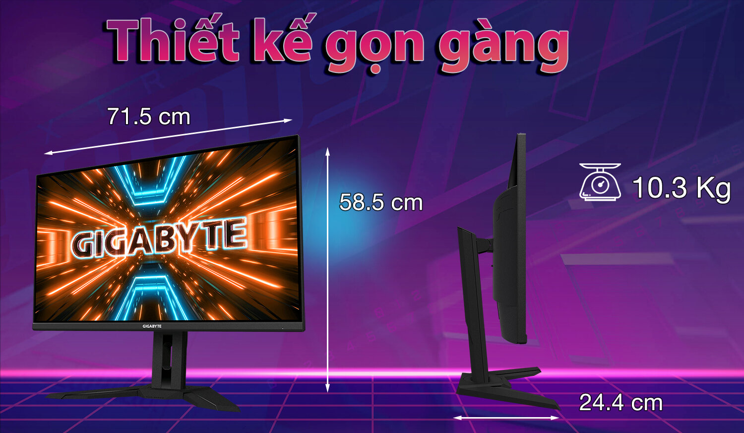 Gigabyte M32U-EK có trọng lượng tổng thể 10.3 kg cùng kích thước rộng 71.5 cm, cao 58.5 cm . Dù chân đế được cấu thành từ nhựa nhưng vẫn tỏ rõ sự cứng cáp thiết kế gọn nhẹ, mang đến sự di động cho phép bạn di chuyển đến bất kỳ vị trí nào trên bàn làm việc hay bàn học một cách dễ dàng.