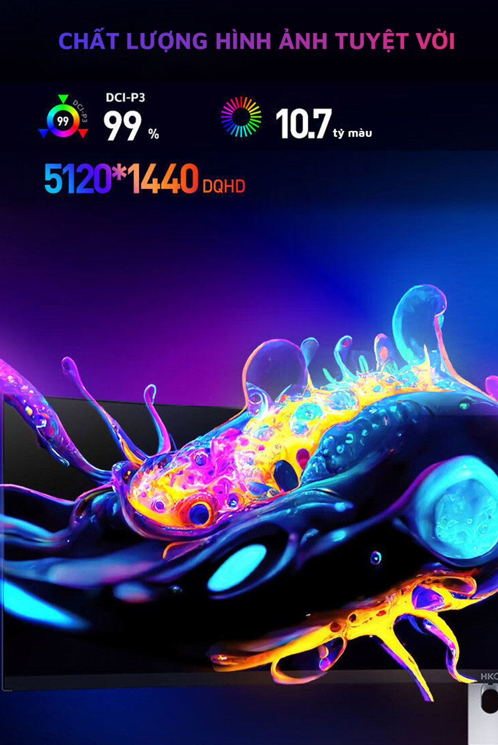 Màn hình HKC MG49P2 có độ phủ gam màu DCI-P3 lên tới 99% vavf độ sâu màu 10bit màu nguyên bản. Với sắc màu phogn phú và lộng lẫy, màn hình mang lại trải nghiệm chất lượng hiển thị sống động và chuyển tiếp mượt mà qua độ phân giải DQHD 5120 x 1440. Nó mang tới chất lượng hình ảnh cao cho các tác vụ như thiết kế đồ họa đến các tựa game 3A.