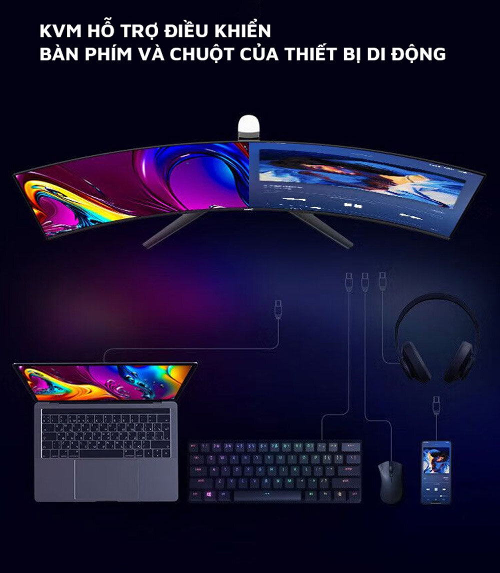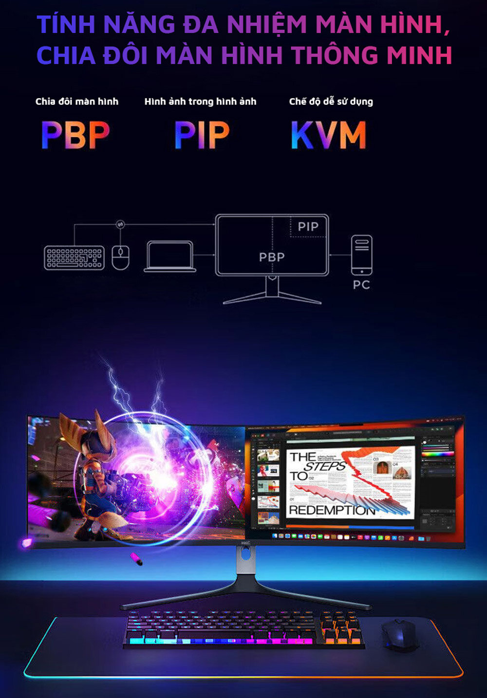 Màn hình hỗ trợ tính năng đa nhiệm PbP/PiP với chức năng chia nhỏ màn hình một cách khoa học, thông minh. Ngoài ra, nó còn có thể kết nối song song với nguồn xuất hình kép, xử lý linh hoạt các cửa sổ nhỏ hiển thị, tăng hiệu quả công việc. Tính năng KVM giúp việc sử dụng một cách thuận tiện hơn khi kết nối với nhiều thiết bị.