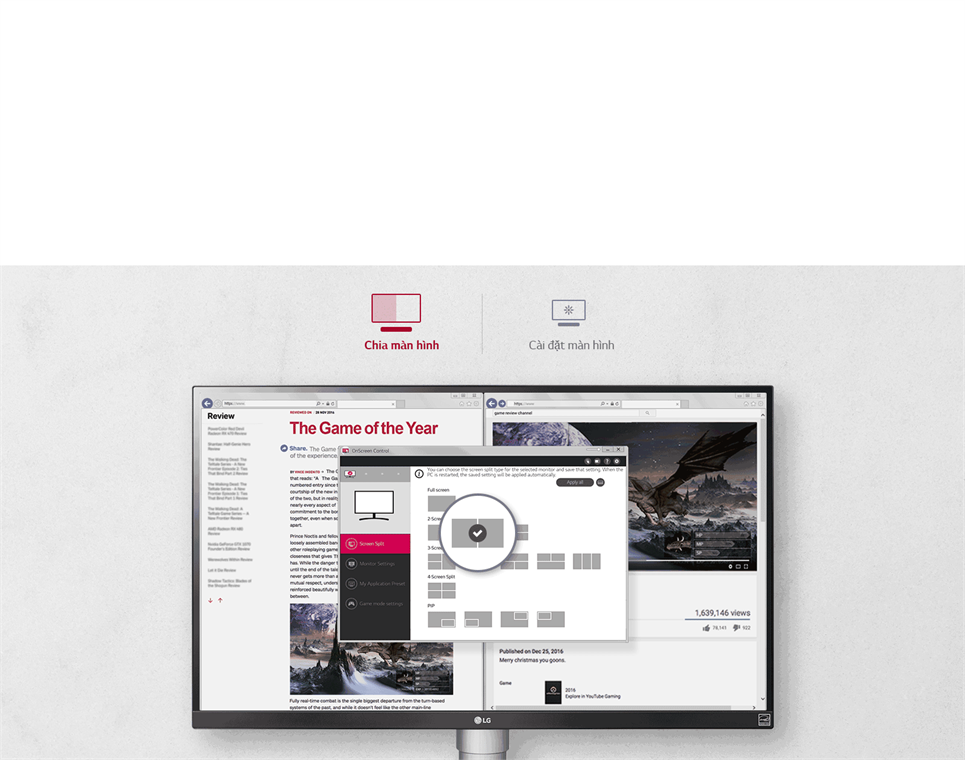 On-Screen Control On Screen Control giúp người dùng tùy chỉnh nhanh cài đặt màn hình nhanh và dễ dàng. Giờ đây bạn có thể điều chỉnh Âm lượng, độ sáng, đặt sẵn chế độ hình ảnh, Tách màn hình 2.0 và Bộ điều khiển kép và nhiều cài đặt khác chỉ bằng một vài cú nhấp chuột, thay vì sử dụng các nút cứng trên màn hình. Yêu cầu phải tải xuống phần mềm để bật On Screen Control. Để biết chi tiết tải xuống, vui lòng truy cập trang chủ LG Việt nam