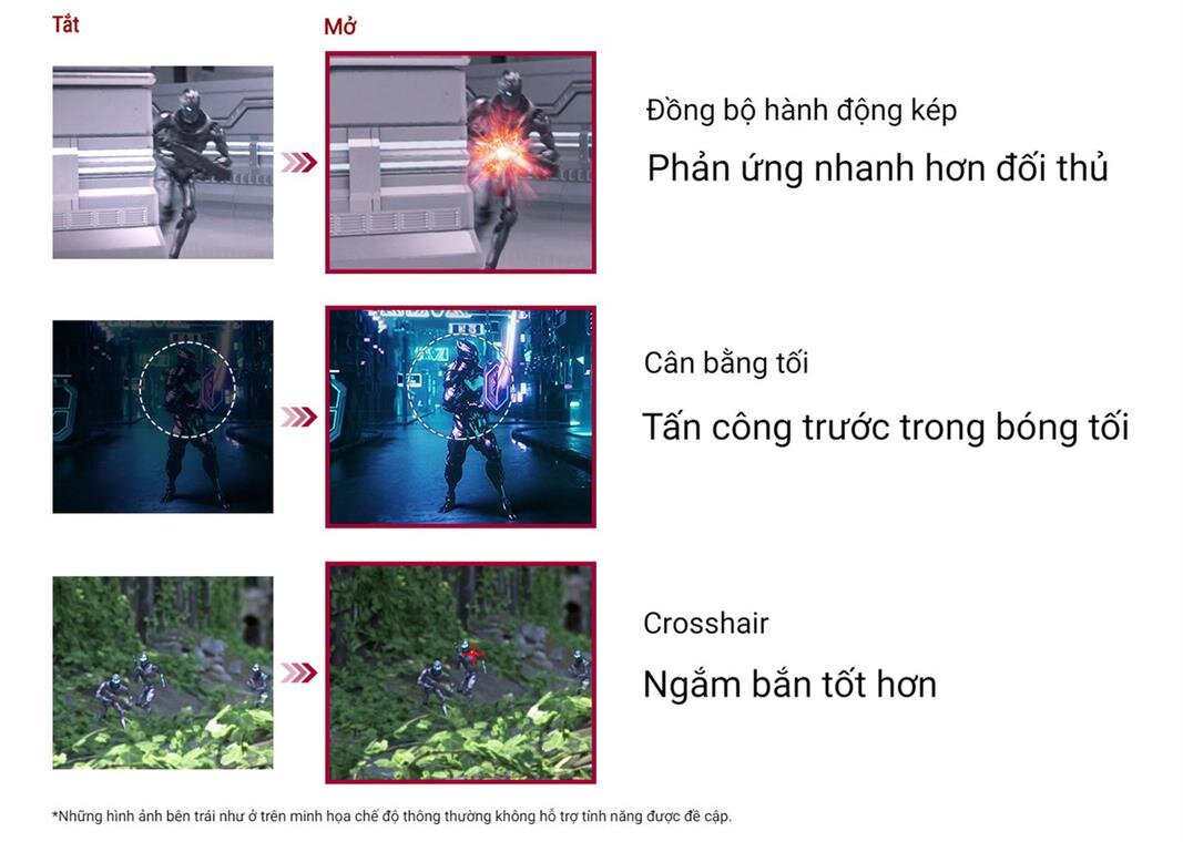 Nhiều tính năng hỗ trợ chơi game Phản ứng nhanh hơn đối thủ của bạn: Giảm thiểu độ trễ của thao tác đầu vào với công nghệ Đồng bộ hành động động và người chơi có thể nắm bắt được mọi khoảnh khắc theo thời gian thực. Tấn công trước trong bóng tối: Người chơi game có thể tránh các tay súng bắn tỉa trốn ở những nơi tối nhất và nhanh chóng thoát khỏi tình huống nguy hiểm. Ngắm bắn tốt hơn: Điểm ngắm mục tiêu cố định ở chính giữa để tăng cường độ chính xác khi bắn.