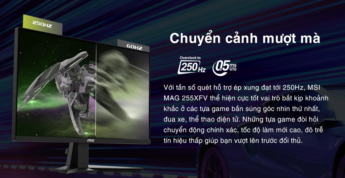 Trong các tựa game FPS, MOBA, hay các game đua xe, tần số quét cao giúp bạn dễ dàng nhận biết các chi tiết nhỏ, phản ứng nhanh hơn và có lợi thế hơn so với đối thủ. Tần số quét 250Hz giúp hình ảnh chuyển động mượt mà, loại bỏ hiện tượng xé hình và nhòe hình, mang đến trải nghiệm chơi game cực kỳ đã.