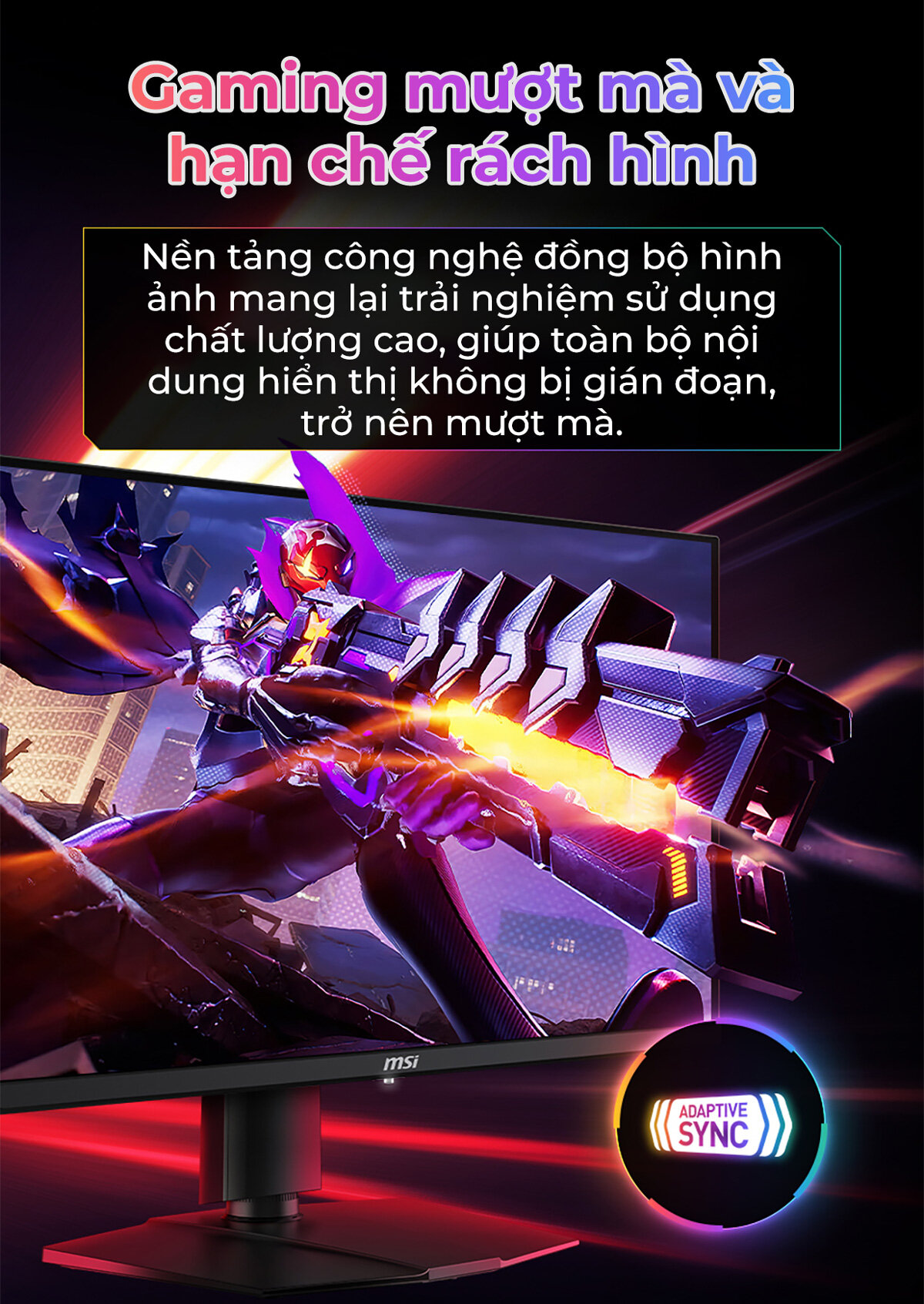 Công nghệ Adaptive-Sync sẽ đồng bộ tần số quét trên màn hình và GPU để loại bỏ hiện tượng xé, giật hình. Hình ảnh cực kỳ mượt mà và không bị lag bởi công nghệ này cho phép game thủ tận hưởng trò chơi theo cách nó được tạo ra.