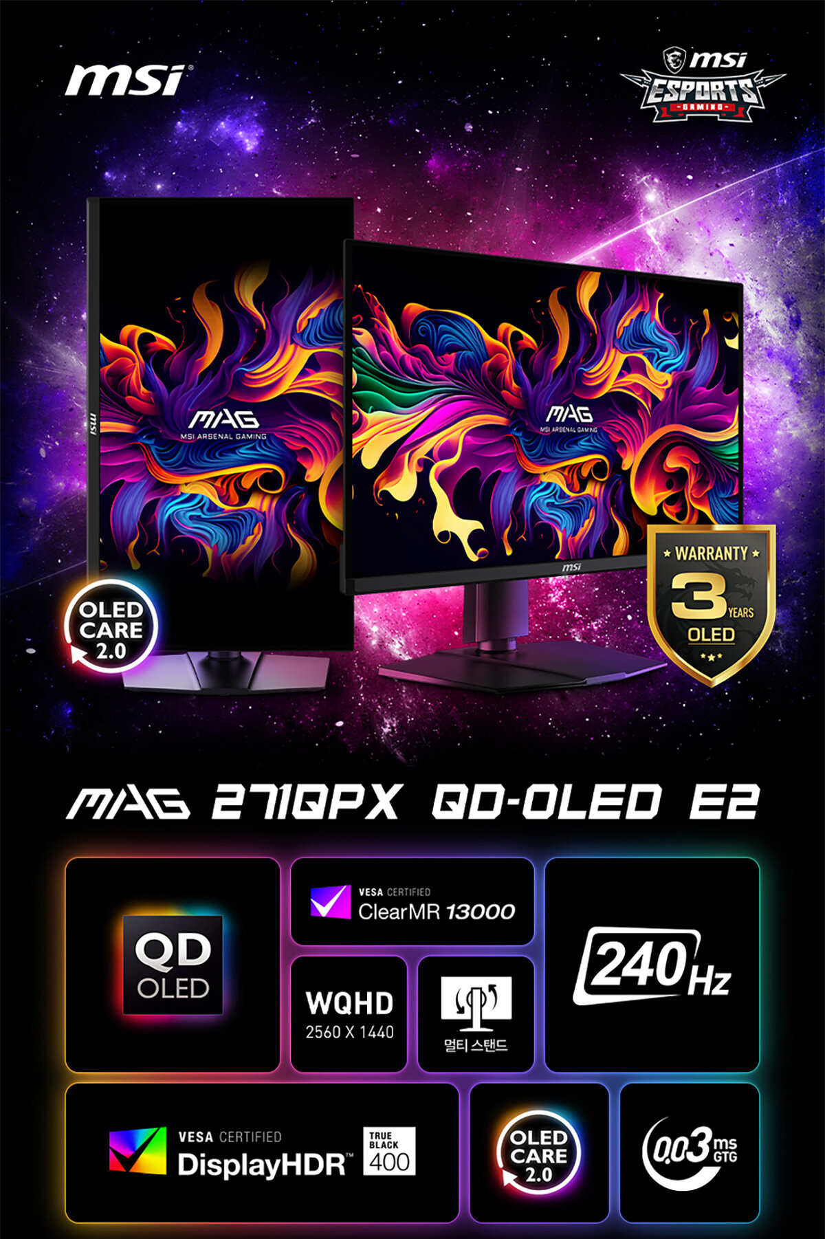 MAG 271QPX QD-OLED E2 sẽ hiện thực hoá chiến thắng của bạn với màn hình chơi game. Mẫu màn hình được trang bị tấm nền QD-OLED thế hệ tiếp theo độ phân giải 2560x1440 (WQHD), tốc độ quét hình 240Hz và thời gian phản hồi nhanh 0,03ms(GtG). Chứng nhận VESA cho ClearMR 13000 và DisplayHDR True Black 400 đảm bảo hình ảnh thể hiện cực kỳ sống động và giảm thiểu hiện tượng nhòe chuyển động. OLED Care 2.0 giảm thiểu nguy cơ burn-in trên màn hình OLED. Đối với các game thủ hệ máy console, MAG 271QPX QD-OLED E2 được trang bị cổng HDMI 2.1 với băng thông 48Gbps, hỗ trợ tốc độ 120Hz, VRR và ALLM.