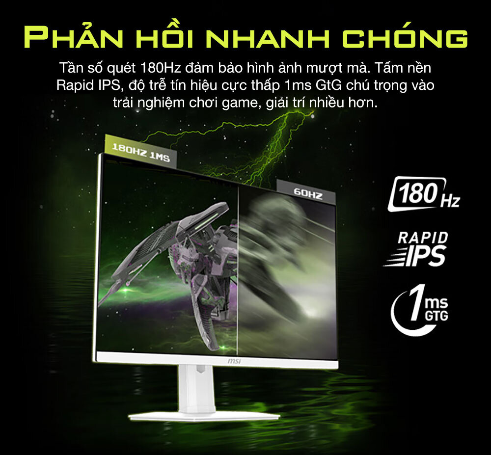 Tăng tốc nhanh nhờ vào tần số quét 180Hz và thời gian phản hồi 1ms. Trải nghiệm chơi game mượt mà với tốc độ làm mới và thời gian phản hồi cực nhanh, giúp bạn chiếm thế thượng phong trong các trò chơi chuyển động nhanh. Công nghệ Adaptive-Sync giúp chơi game mượt mà, không giật hình, không xé hình.