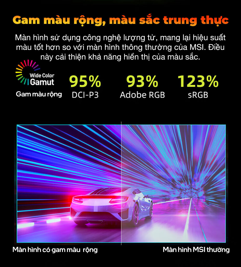 Khả năng tái tạo màu ở cấp độ sáng tạo nội dung là 93% Adobe RGB, 95% DCI-P3 và 123% SRGB bằng cách sử dụng lớp công nghệ Quantum Dot được thiết kế linh hoạt.