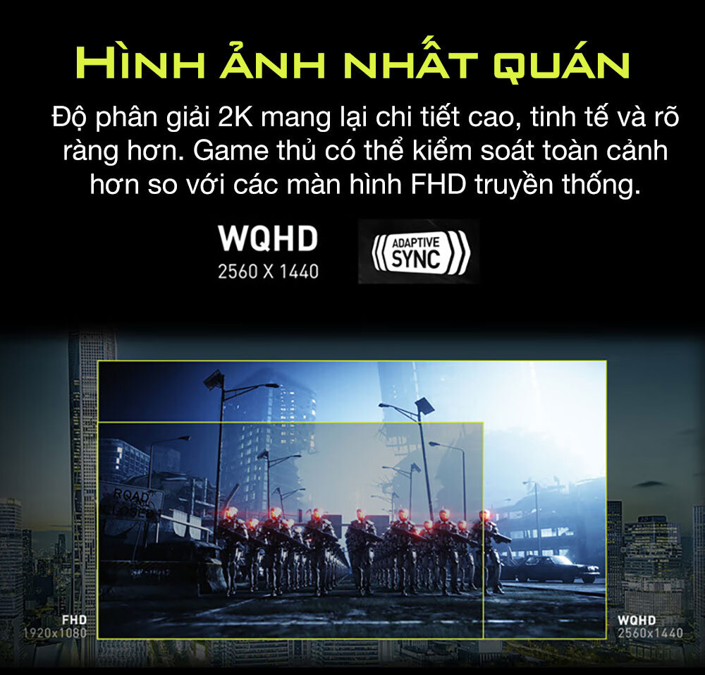 Độ phân giải cao WQHD 2K giúp nội dung giải trí sẽ trông đẹp hơn nữa, hiển thị nhiều chi tiết hơn. Màn hình 16:9 này cho phép game thủ kiểm soát toàn bộ trận đấu hơn so với những màn hình có độ phân giải FHD thông thường.