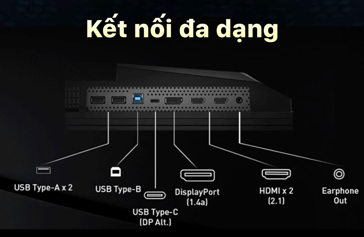 Màn hình MSI MPG 271QRX QD-OLED được trang bị nhiều cổng kết nối hiện đại như HDMI 2.1, DisplayPort 1.4a và USB Type-C. Điều này giúp người dùng dễ dàng kết nối với nhiều thiết bị khác nhau, từ máy tính, laptop đến các thiết bị chơi game console. Các cổng kết nối này không chỉ đảm bảo truyền tải tín hiệu nhanh chóng mà còn hỗ trợ các tính năng tiên tiến như VRR và ALLM, mang lại trải nghiệm sử dụng tối ưu.