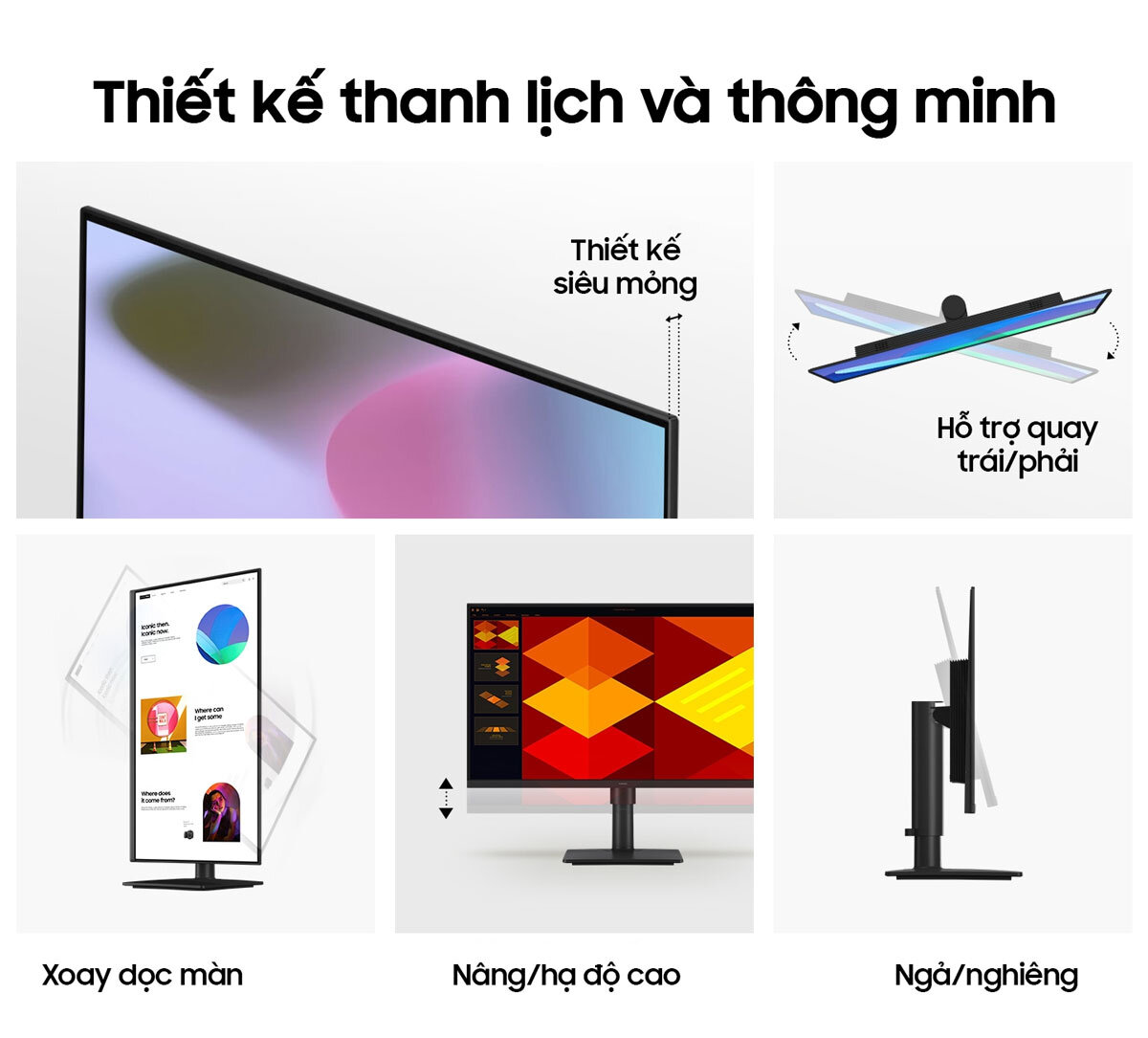 Màn hình sở hữu thiết kế thanh lịch với viền bezel mỏng, giúp tối đa hóa diện tích hiển thị và mang đến trải nghiệm hình ảnh liền mạch. Chân đế của màn hình được thiết kế thông minh, cho phép người dùng dễ dàng điều chỉnh độ cao, góc nghiêng và xoay màn hình theo ý muốn, giúp bạn tìm được tư thế làm việc thoải mái nhất.