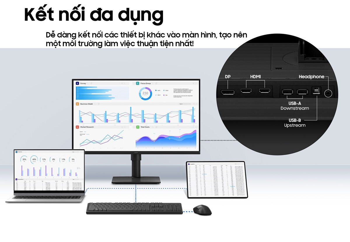 Màn hình LS22D400GAEXXV được trang bị đầy đủ các cổng kết nối phổ biến như: HDMI, DisplayPort, USB. Hai cổng xuất hình HDMI và DisplayPort giúp chất lượng hình ảnh luôn ở mức tốt nhất có thể và chuyển động liền mạch với tần số quét 100Hz. USB kết nối các thiết bị ngoại vi như bàn phím, chuột...ngay trên màn hình