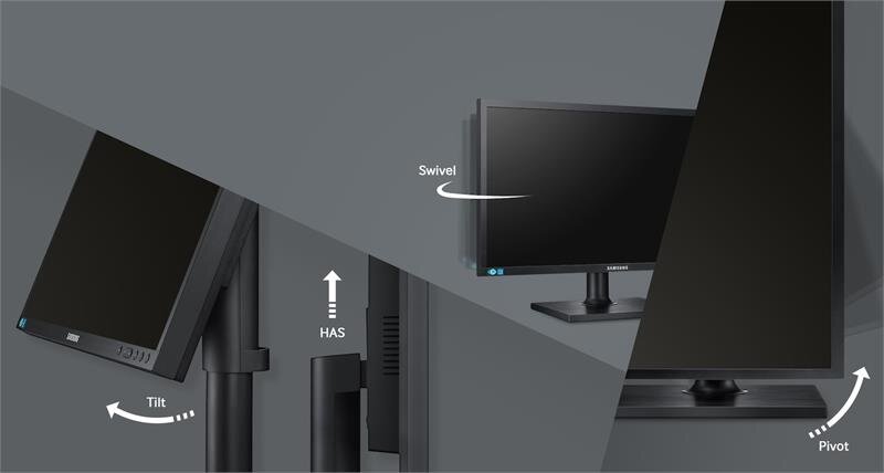 • Hệ thống chân đế vững chắc (HAS): Dễ dàng điều chỉnh độ cao màn hình lên đến 130mm. • Tính năng Tùy Chỉnh Độ Nghiêng: Cho bạn góc nhìn thoải mái với khả năng nghiêng trước 25° và nghiêng sau 3°. • Tính năng Xoay Màn Hình: Nhanh chóng và dễ dàng xoay trái, xoay phải màn hình đến 45°, giúp tối ưu hiệu quả làm việc nhóm. • Giá treo VESA: Với giá treo VESA 100x100, cho lựa chọn treo tường linh hoạt.