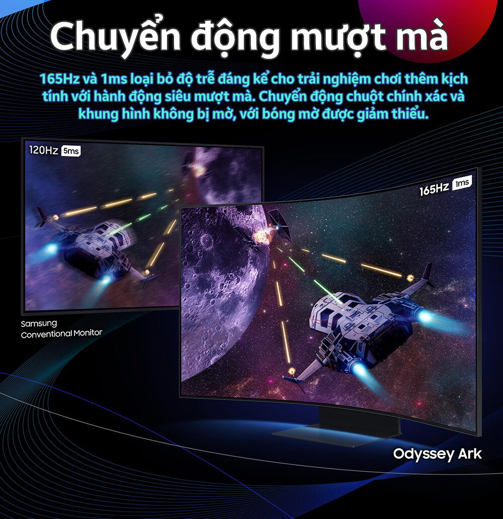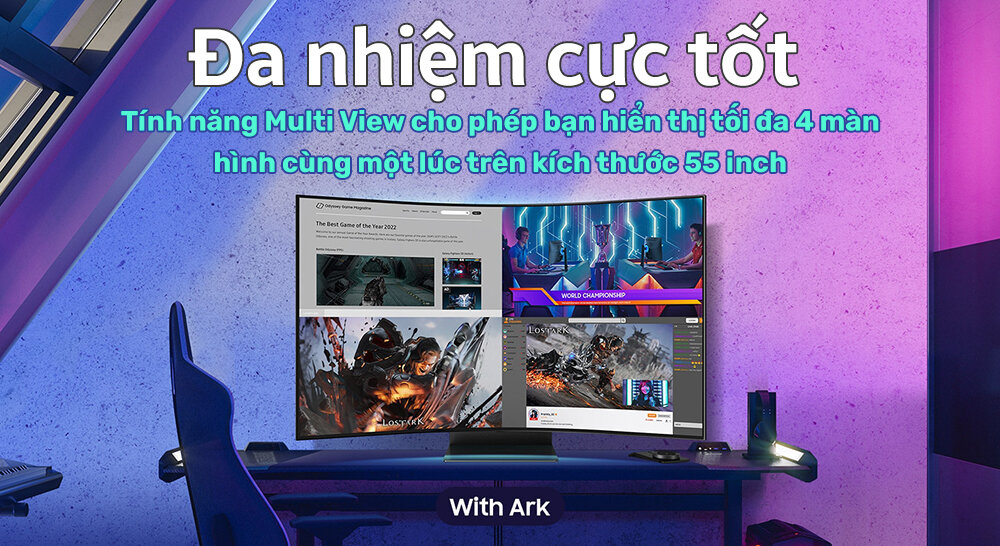 Samsung Odyssey Ark G97NB là màn hình gaming 55 inch và có độ cong 1000R đầu tiên trên thế giới. Sở hữu kích độ phân giải 4K UHD tỉ lệ 16:9 tương đương với các dòng màn hình TV hiện tại. Thời gian phản hồi ngắn cùng công nghệ Neural Quantum Processor Ultra cho gia tăng chất lượng hiển thị. Chế độ Cockpit (buồng lái) cho phép nâng màn hình lên và xoay dọc lại, tạo không gian làm việc cũng như giải trí đa nhiệm, khi có thể chia ba màn hình cho các tác vụ khác nhau thay vì phải gắn nhiều màn hình.