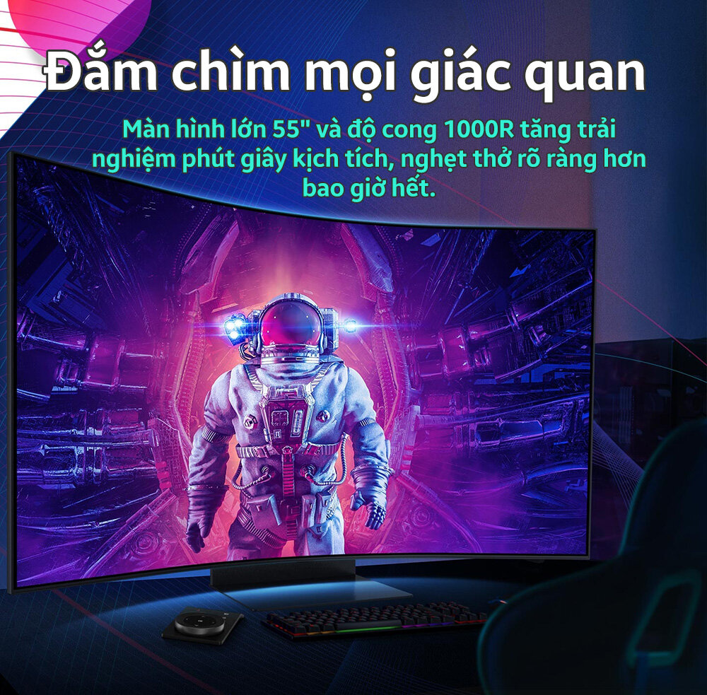 Chiếm ngưỡng thế giới game rộng lớn với màn hình cực đại 55-inch và độ cong 1000R mãn nhãn. Công nghệ Quantum Mini-LED mang đến độ sâu hoàn hảo, kết hợp cùng công nghệ Âm thanh vòm cho trải nghiệm âm thanh đắm chìm mọi giác quan.
