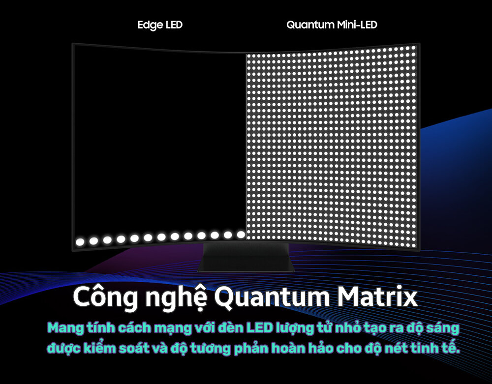 Công nghệ đèn nền Quantum Matrix phân tích và kiểm soát độ sáng tối của mini-Led. Tăng khả năng hiển thị hình ảnh chi tiết, màu sắc chân thực hơn. Giảm thiểu khuyết điểm hở sáng như ở công nghệ IPS, tạo chiều sâu của nội dung hiển thị