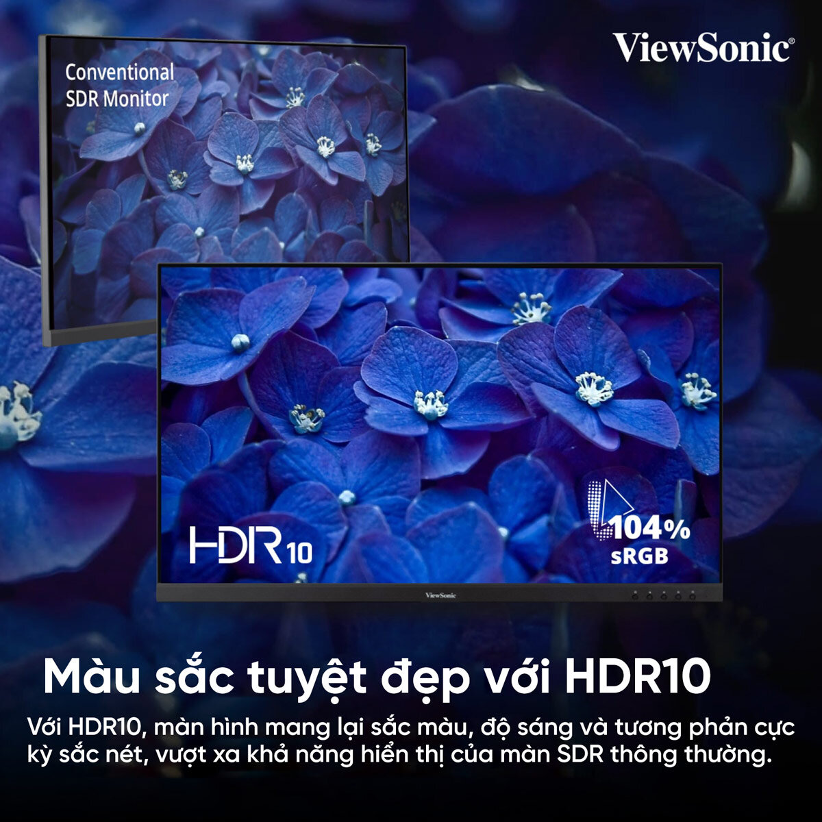 Công nghệ HDR10 giúp tăng cường độ tương phản giữa vùng sáng và vùng tối, tạo ra hình ảnh có chiều sâu và chân thực hơn. Màu sắc được tái tạo một cách sống động, rực rỡ, mang đến trải nghiệm thị giác tuyệt vời. Màn hình bao phủ gần như toàn bộ gam màu sRGB, đảm bảo màu sắc hiển thị chính xác, phù hợp với nhu cầu làm việc đồ họa, thiết kế.