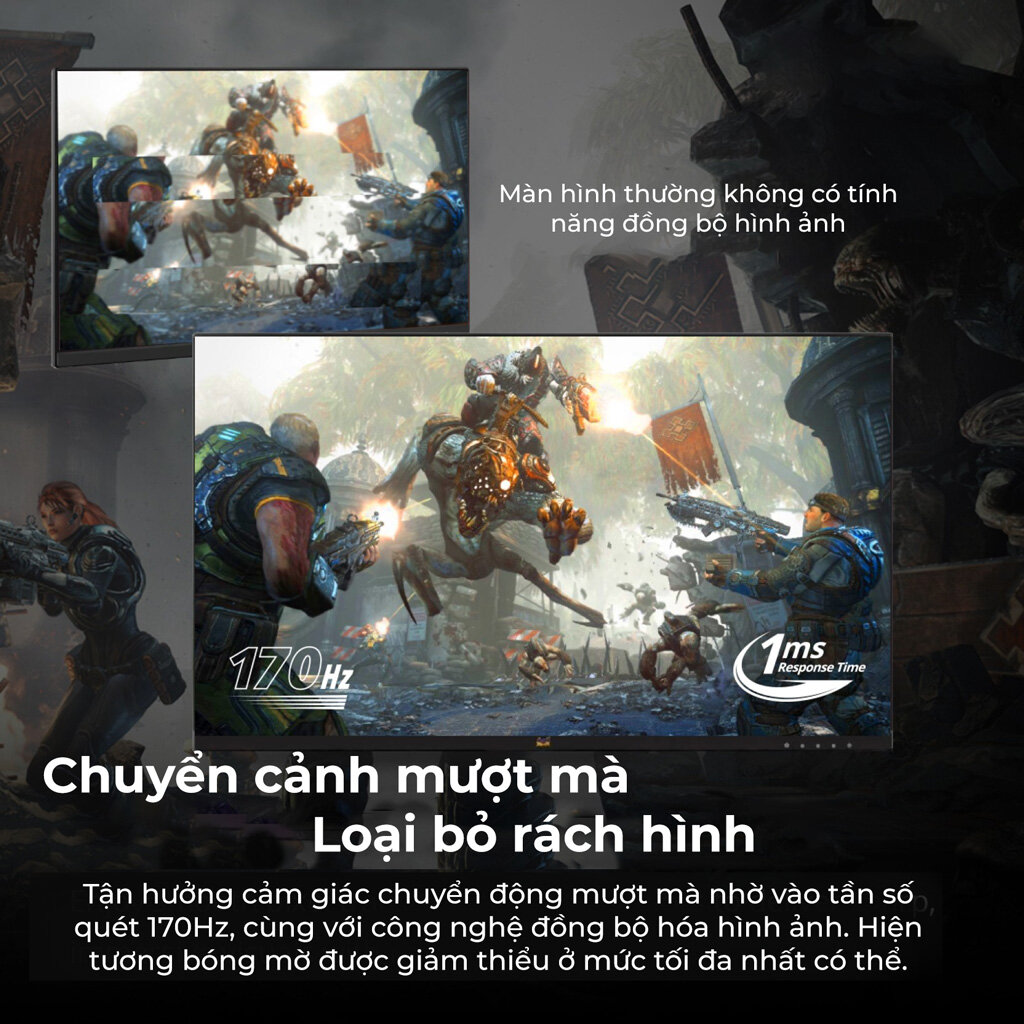 Tần số quét 170Hz khiến nội dung chuyển động mượt mà nhất có thể. Đặc biệt với những tựa game có tính cạnh tranh, màn hình thể hiện tốt trong vai trò kiến tạo những lợi thế ưu việt hơn đối thủ. Độ trễ tín hiệu đạt mức thấp 1ms sẽ là miếng ghép hoàn hảo để trải nghiệm người dùng được trọn vẹn hơn. Tính năng này sẽ đẩy lùi hiện tượng lưu ảnh khó chịu.