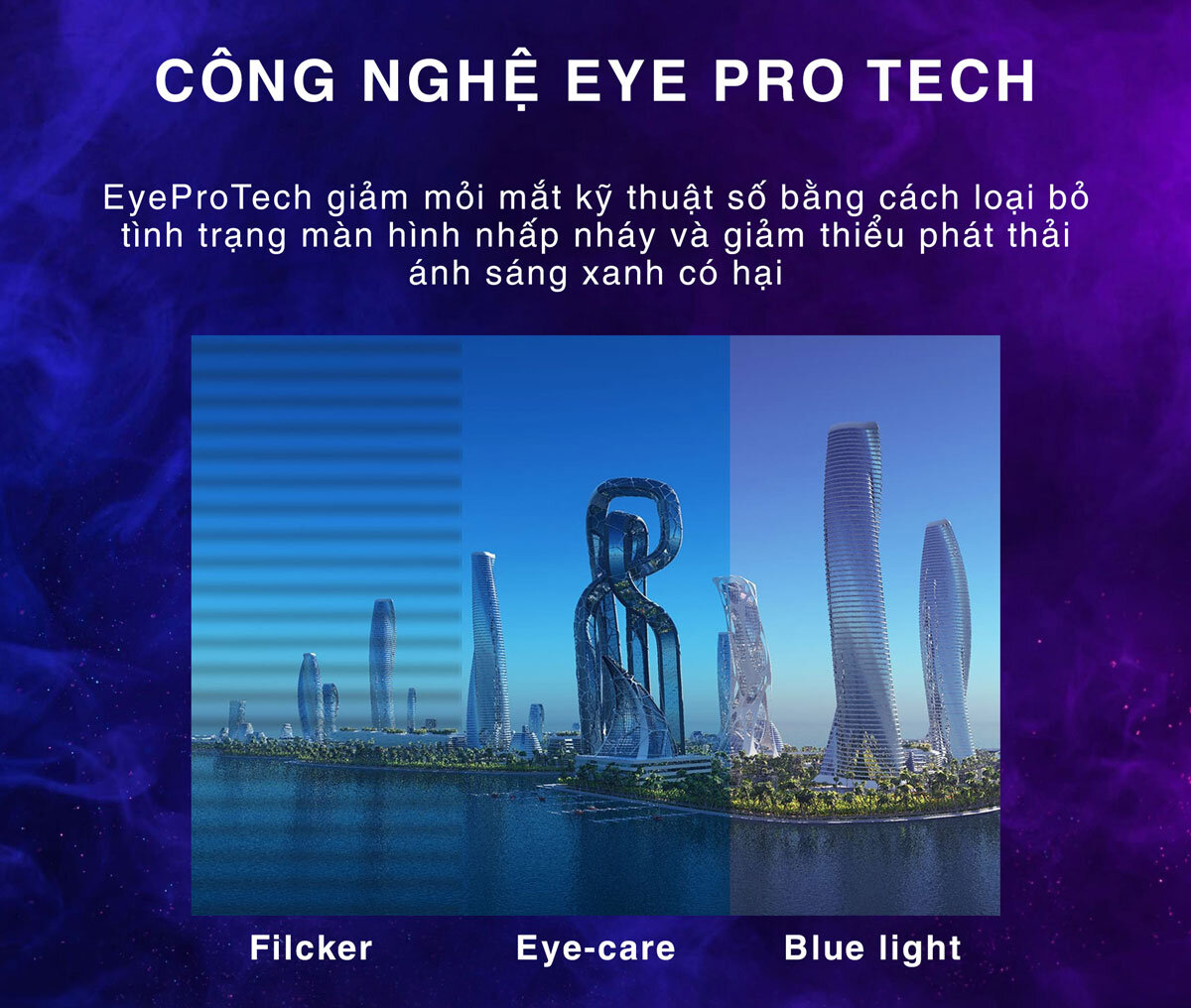 Công nghệ lọc ánh sáng xanh giúp giảm thiểu tác động tiêu cực của ánh sáng xanh đến mắt, giảm mỏi mắt và cải thiện chất lượng giấc ngủ. Tính năng chống nhấp nháy giúp giảm thiểu hiện tượng nhấp nháy màn hình, giảm mỏi mắt và tăng cường sự thoải mái khi sử dụng trong thời gian dài.