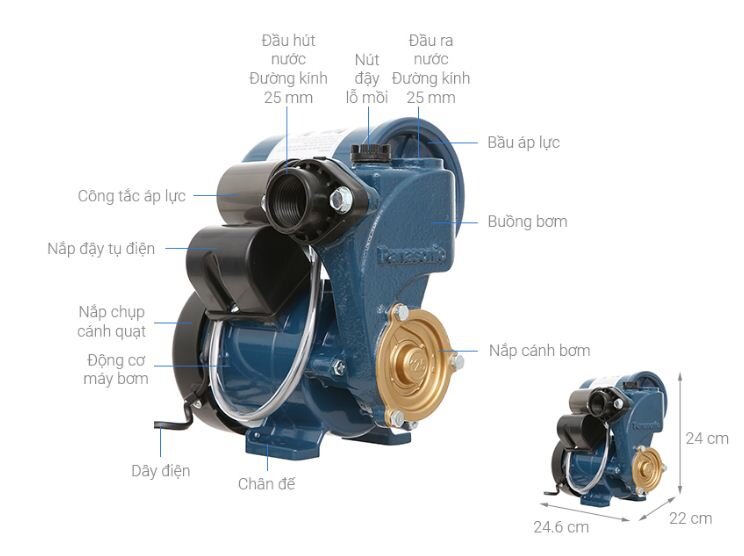 Thân máy bơm nước Panasonic A-130JAK được chế tạo từ nhôm đúc, cánh bằng đồng đảm bảo độ bền, chịu va đập tốt. Bên ngoài được phủ lớp sơn chống gỉ, cách điện đảm bảo an toàn khi dùng ở môi trường ẩm ướt. Lõi mô tơ quấn dây đồng cực bền.