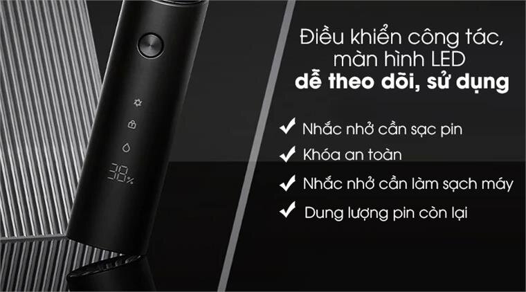 Điều khiển bằng công tác, tiện theo dõi hoạt động máy với màn hình LED Trên màn hình này của máy cạo râu hiển thị 4 thông số: % dung lượng pin còn lại, nhắc nhở cần sạc pin khi sắp hết, nhắc nhở cần làm sạch máy và khóa an toàn vô hiệu hóa hoạt động máy, đảm bảo an toàn cho người dùng. Có 2 chế độ cạo tiêu chuẩn và cao, cho bạn tùy chọn theo nhu cầu.
