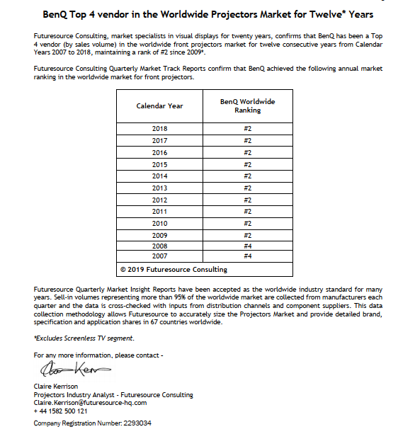 Dưới đây là chứng nhận top 4 thương hiệu máy chiếu bán chạy nhất trên thế giới trong đó có thương hiệu BenQ đứng thứ 2