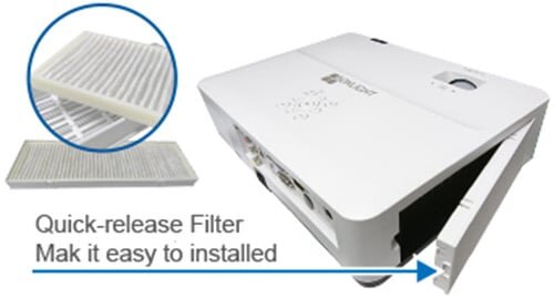 Bộ lọc ESD được tích hợp hệ thống tự động phát hiện, luôn kiểm tra lượng không khí của máy chiếu để xem bộ lọc có bị tắc nghẽn hay không. Do đó, máy có thể chủ động đưa ra báo động thông báo lọc sạch để bảo vệ và nâng cao tuổi thọ.