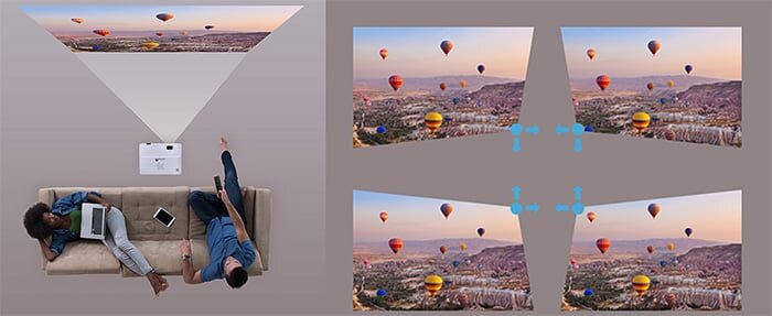 Với chức năng Corner Keystone, màn chiếu sẽ không còn lệch cùng khả năng zoom kỹ thuật số, zoom quang học 1.2X cùng kích thước chiếu từ 30 - 300 inch đem tới tỷ lệ trình chiếu vàng 16:9 và 4:3.