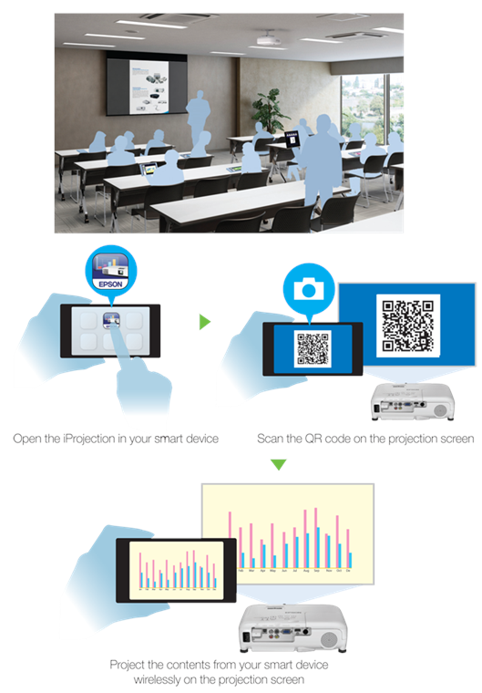* Ứng dụng Epson iProjection QR: Với ứng dụng iProjection cho cả iOS và Android, tính năng này hỗ trợ nhiều tập tin khác nhau, cho phép người dùng trình chiếu mọi nội dung điện thoại một cách dễ dàng và sử dụng các chức năng cảm ứng trên màn hình như flick để chuyển trang hoặc phóng to/thu nhỏ.
