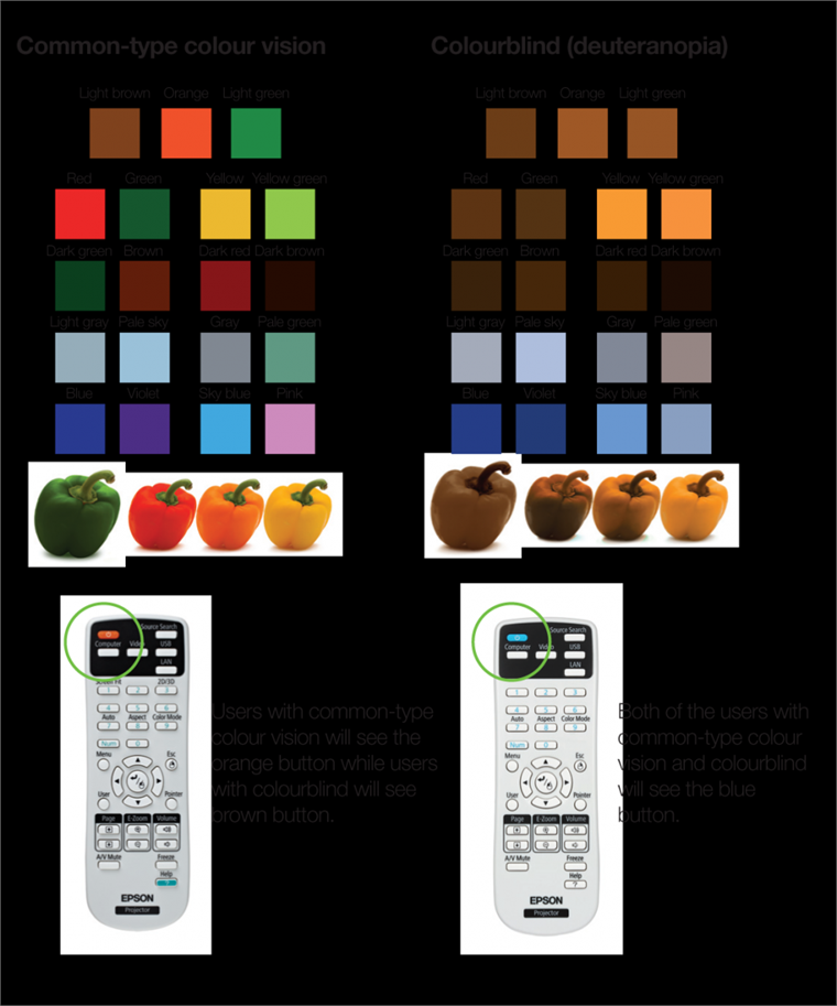 * Thiết kế màu sắc thông dụng: Do mỗi người có mỗi cách nhìn màu khác nhau, Epson đã thiết kế các màu sắc thông dụng sử dụng những thang màu có thể dễ dàng xác định và phân biệt do đó thông tin quan trọng luôn được chuyển tải một cách chính xác. Với hệ thống thiết kế hướng đến người dùng, các chức năng trên màn hình, đèn LED và bộ điều khiển từ xa có thể được quan sát và sử dụng dễ dàng.