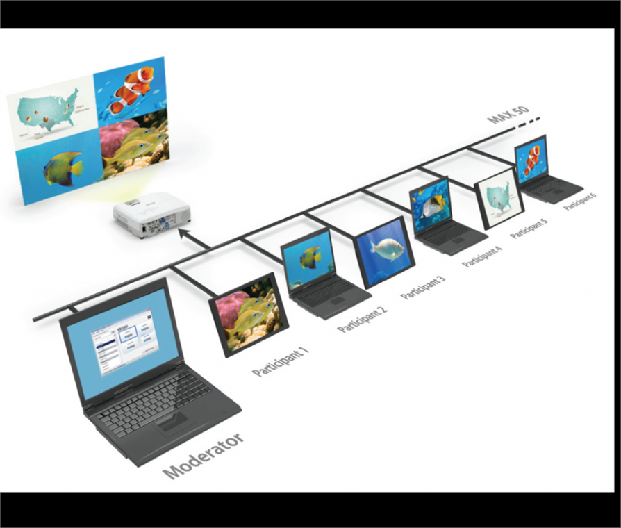 Dưới sự kiểm soát của PC chủ, chỉ một máy chiếu có thể kết nối với 50 thiết bị đầu cuối khác nhau nhờ vào tính năng chiếu nhiều PC. Máy tính chủ hoạt động như bộ phận điều tiết - lựa chọn loại phương tiện từ 4 thiết bị đầu cuối để chiếu đồng thời. Với chức năng này, người dùng có thể duy trì kiểm soát và ngăn tính trạng can thiệp vào hình ảnh chiếu trên màn hình