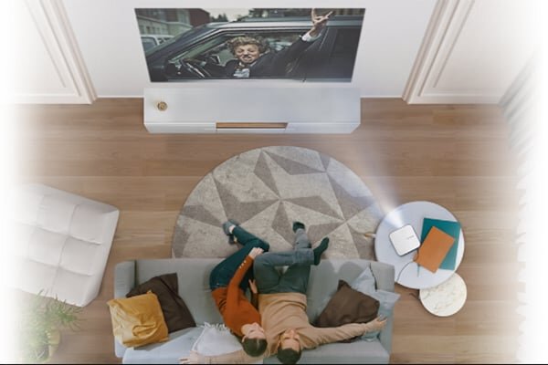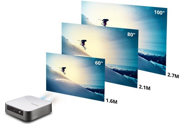 Giờ đây bạn không cần phải lo về không gian căn phòng hẹp vì máy có thể hiển thị màn hình lên đến 100 inch từ khoảng cách 2,7m.
