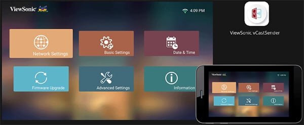 Với ứng dụng ViewSonic vCastSender và kết nối thông qua cùng một mạng Wi-Fi trên điện thoại để điều hướng dễ dàng, nhập liệu dễ dàng và chú thích trên màn hình lớn.