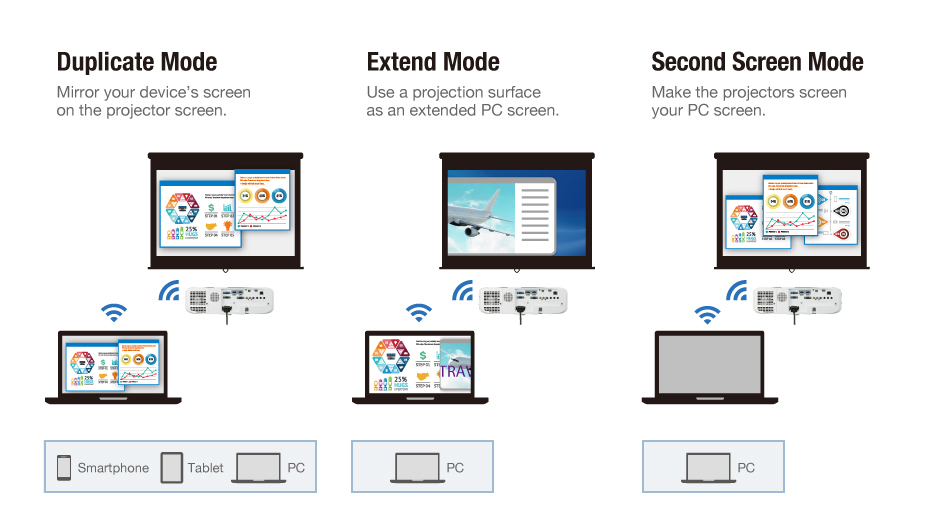 Chế độ trình chiếu đa dạng Với 3 chế độ trình chiếu tùy chọn, người dùng có thể chọn một thiết bị khác được kết nối trình chiếu nội dung hoặc hiển thị nội dung liền mạch qua Miracast. Kết nối USB Máy Chiếu Panasonic PT-VZ585N cho phép người dùng truyền thông tin qua cổng USB một cách vô cùng tiện lợi, bạn chỉ cần cắm USB vào cổng USB là có thể trình chiếu ảnh tĩnh hoặc video ngay lập tức mà không cần mạng hoặc cài đặt bất kì phần mềm nào.