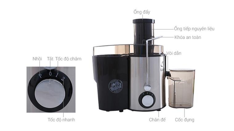 Chất liệu cao cấp Thân máy được làm bằng chất liệu nhựa ABS cao cấp, bền bỉ và chống rỉ sét. Lưỡi dao và bộ lọc được làm bằng thép không gỉ, an toàn cho người sử dụng. Lưới lọc nhỏ mịn giúp lọc sạch bã trái cây hiệu quả. Bình chứa nước làm từ nhựa PE cao cấp, rất vệ sinh và an toàn sức khỏe. Thiết kế đơn giản, tiện dụng Đầu ép sản phẩm thiết kế cao, lớn nên có thể ép đc cả quả táo, lê, carot... mà không cần cắt nhỏ, loại bỏ hoàn toàn khả năng chạm bám vào bề mặt lươi dao, tuyệt đối an toàn cho người sử dụng. Núm vặn thông minh hiện thị các tốc độ xay ép rõ ràng, dễ sử dụng. Chân đế của máy được đệm miếng lót cao su giúp máy vận hành êm ái, không trượt ngã khi sử dụng. Dung tích chứa lớn Máy ép có ngăn chứa bả lên tới 1 lít và dung tích bình chứa đến 600ml cho phép người dùng ép được nhiều trái cây cùng một lúc cho cả gia đình.