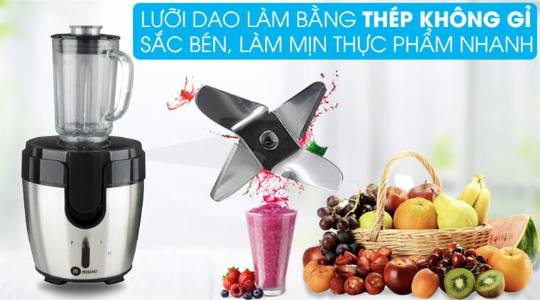 sử dụng lưỡi dao bằng thép không gỉ, sắc bén, độ bền cao hạn chế tình trạng văng trong khi xay, lưới lọc bảo đảm an toàn vệ sinh thực phẩm.
